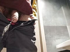 Compilation of three public restroom cumshots with jizz on the ground featuring a cock ring handjob on a hard dick in a public toilet
