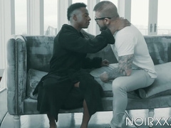 Two hung black studs take on a married man while a woman joins in, stretching his ass and leaving him covered in cum
