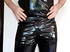 Jerk off and pee in a blue PVC suit