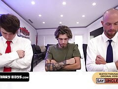 Two daring boys talk shy, inexperienced young stud into hot bareback oral and anal threesome